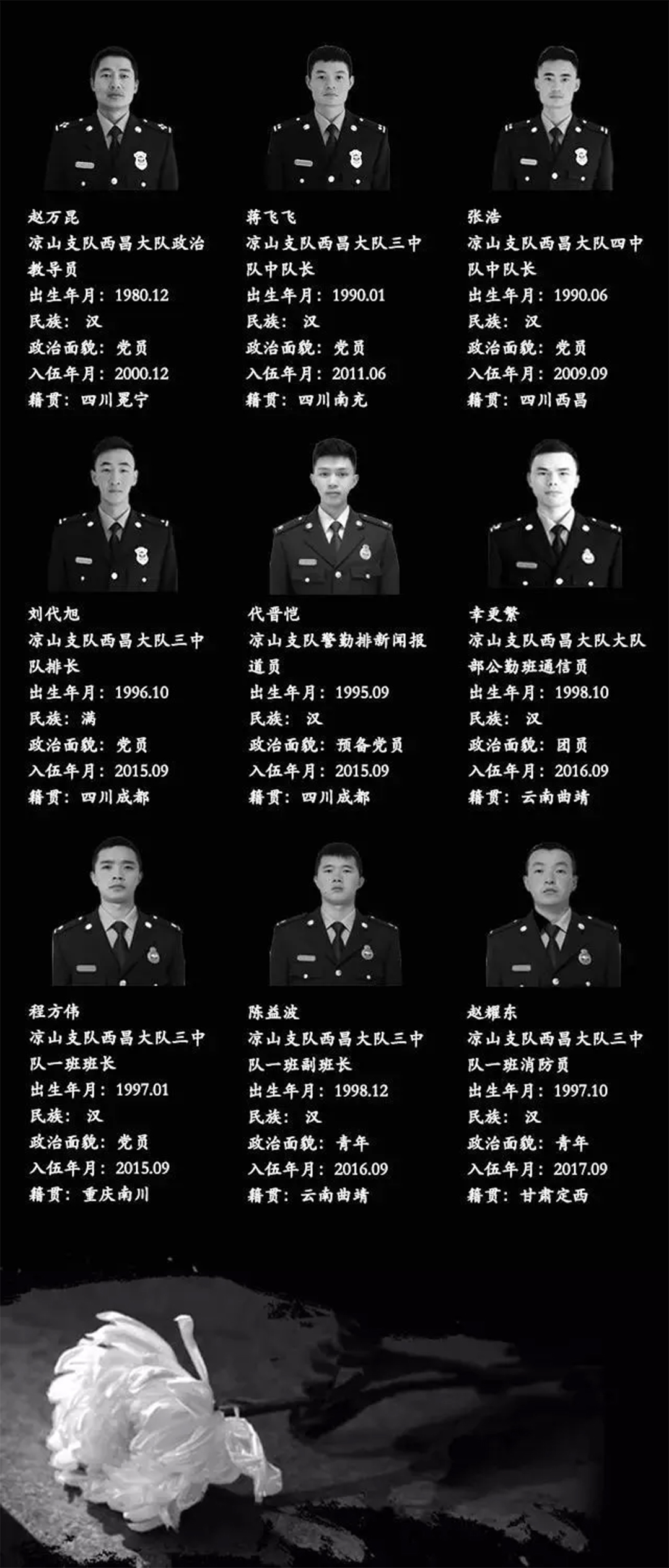 這是一場(chǎng)慘烈的“斗爭(zhēng)”,為了拯救人民財(cái)產(chǎn)、動(dòng)植物等的犧牲,這是一份沉重的名單,經(jīng)統(tǒng)計(jì)核實(shí),有27名同志系涼山州森林消防支隊(duì)指戰(zhàn)員。27人中有干部4人、消防員23人。漢族22人、滿(mǎn)族1人、黎族1人、彝族2人、畬族1人。1980年后出生1人,1990年后出生24人,2000年后出生2人,年齡最小為2000年7月出生。中共黨員9人(含預(yù)備黨員1人),共青團(tuán)員11人,青年7人。